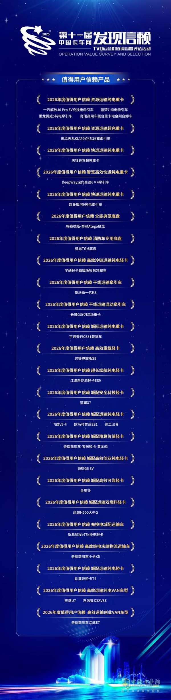 Organised by China Trucks and co-hosted by the Logistics Investment and Financing Branch of the China Communications and Transportation Association, the annual program is based on large-scale user feedback and aims to identify commercial vehicle products and solutions that have earned long-term trust from truck users.