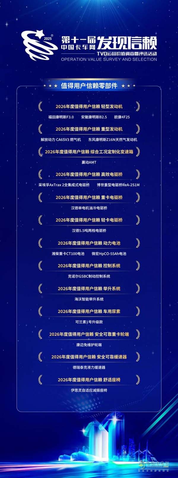 Awards were presented in categories such as engines, transmissions, electric drive axles, batteries, braking systems, lifting systems, aftertreatment fluids, wheel ends, retarders and driver seats. Organisers said component winners were selected based on long-term operational performance and user recognition.