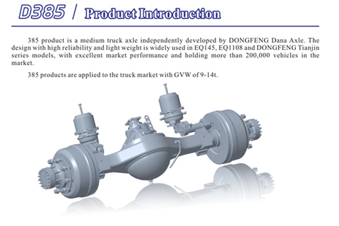 385 product is a medium truck axle independently developed by Dongfeng Dana Axle. The design with high reliability and light weight is widely used in EQ145, EQ1108 and Dongfeng Tianjin series models, with excellent market performance and holding more than 200,000 vehicles in the market.