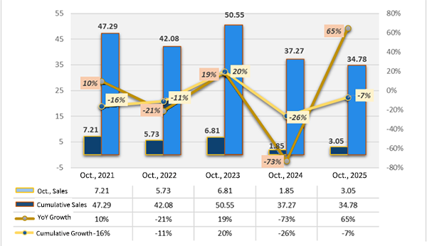Total sales: 30,500 units, up 65% year-on-year, slightly below September’s 82% increase.