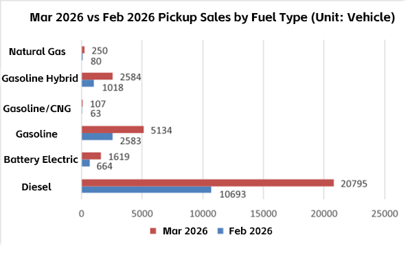 - Battery electric pickups totaled 1,619 units, rising 143.83% from February but slipping 0.67% year-on-year